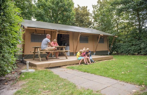 This detached safari tent is sutuated on the green holidaypark Bospark 't Wolfsven, just 12 km. from the city center of Eindhoven. In the safari tent, you can experience the feeling of luxurious camping, so-called glamping; the atmosphere of a tent but with just a little more comfort. In the living room, you will find a TV. The open plan kitchen includes a fridge with freezer compartment. There are three bedrooms, one with a double bed, one with two single beds and a box bed for two. In the bathroom you will find a shower and a toilette. Outside, there is a veranda with a picnic table and an open garden. There is parking for one car in the vicinity of the tent lodge. Bospark 't Wolfsven offers different types of accommodations sleeping up to four, five or six people.