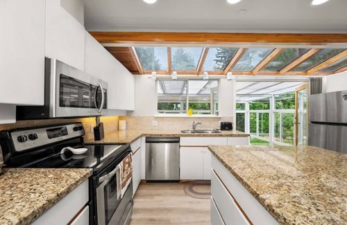 Enjoy cozy elegance in this 3BR, 2BA vintage upper house in North Vancouver — the private main level of a larger home. Relax in a gold-accented bath with hot tub, cook in a marbled kitchen with island bar, and unwind by the deck. Features include a sunny deck, flower-filled garden, walk-in showers, his & her sinks, laundry, and a bright sunroom. A warm, welcoming space — perfect for your stay.