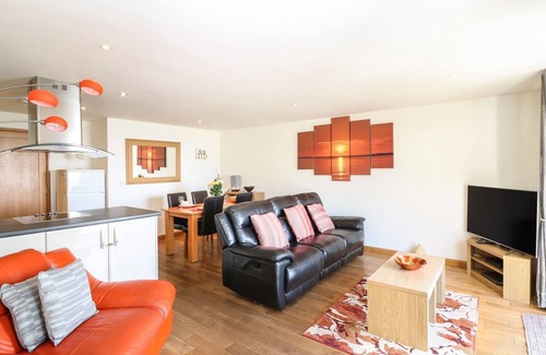 Benefitting from an open-plan layout, this 4 Star Gold holiday apartment is stylishly furnished with a large sofa and armchair with vibrant pops of colour to complement the wood floors and gloss kitchen. The sleek and modern open-plan kitchen with an electric oven, hob, fridge freezer, dishwasher, microwave, toaster, kettle, cafetiere and full range of utensils. There is also a Smart TV and DVD player to enjoy when you are not gazing out to sea!