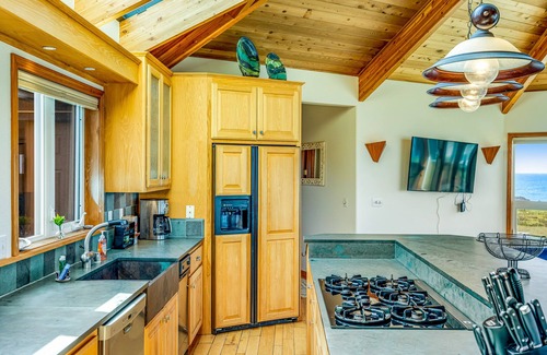 Inside, you'll be greeted by walls of windows on the west side of the house that ensure gorgeous sunset views from the great room, the kitchen, and even the bedrooms. The main living space is open and full of light, offering a lofty ceiling of exposed natural wood, oak floors, and a four-sided gas fireplace that anchors the center of the room. To one side of that fireplace is an elegant kitchen with stainless steel appliances, natural honed slate countertops, and a large island with bar seats for four. Around the other sides are two oceanfront sitting areas, a dining room table, and a flatscreen TV to enjoy once the fog rolls in. There's an additional TV room as well, where you can curl up on the sofa for a movie or set up a board game on the carpet.