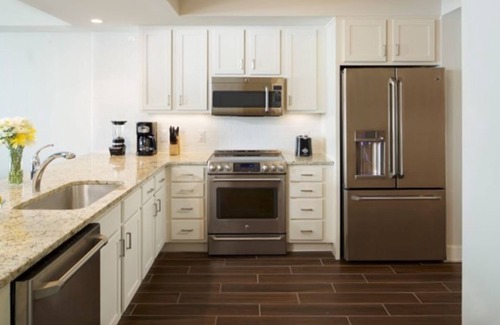 This two-bedroom, two-bathroom suite with ocean-front balcony features a primary suite with king-size bed, full tub, separate walk-in shower and integrated TV in the mirror; a second bedroom with two full-XL beds, bathroom with walk-in shower (full roll-in shower available in Accessible Units); dining room; kitchen with upgraded stainless appliances (GE CAFÉ Series); and a queen-size sofa bed in the living room. The suite also includes a 65" wall-mounted flat-screen TV, ceramic wood tile flooring and tile bathrooms, lighted mirrors in both bathrooms, and stacked washer and dryer (side-by-side in Accessible Units).