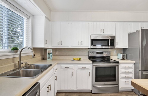 Cooking is a dream in the well-equipped kitchen inside the home, plus there's a grill on the covered porch in the waterfront backyard!