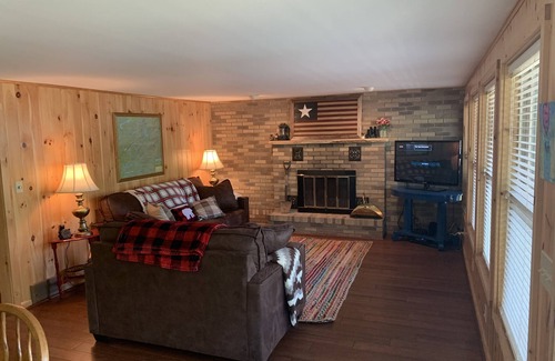 The living room has a wood burning fireplace and plenty of windows facing the lake! The living also includes a cable TV with a DVD player. High-speed WiFi is also provided.