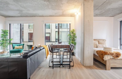 Enjoy a stylish and relaxing stay in this modern 1-bedroom (with Mezzanine) apartment nestled in a quiet residential corner downtown near the Old Port, just a 4-minute walk from Square-Victoria–OACI metro station. Featuring a private balcony, Smart HD TV with streaming, and in-unit washer & dryer, this space is ideal for couples, professionals, or small groups seeking comfort in a prime location.