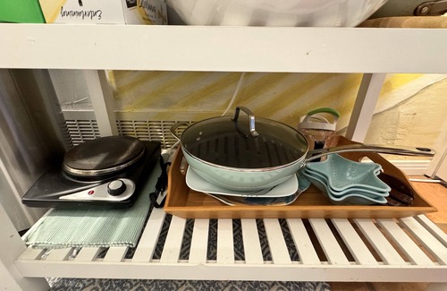 Large flatscreen LG Smart TV is swivel mounted for various viewing options. Closet has a three-drawer dresser, and hanging rods w/plenty of hangers. Iron, extra linens, and beach towels are located in the closet. The hallway transition to bathroom hosts a small ‘kitchenette’ with a 4-foot compact refrigerator (sep. freezer compartment), coffee set-up, and microwave. Butcher block kitchen cart is stocked with dining and food prep utensils, wine & can opener, knives, cook plate, electric kettle, and drip coffee maker. Coffee bureau has a Keurig coffee maker, coffee pods, mini creamers, sugar/splenda, stoneware mugs, plates and bowls, glasses and wine glasses. There is an additional compact fridge located in the bedroom closet, great for beverages and extra groceries.