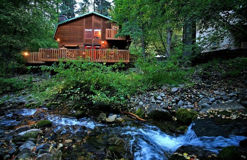 Beautiful cabin, perfect location. Nestled at the end of a quiet private lane and surrounded by huge old growth pines, this is a true mountain hideaway. You can walk out the front door onto a wrap-around deck that's right next to a fast-flowing, cool mountain stream. Relax in the hot tub and be serenaded by the sounds of nature.