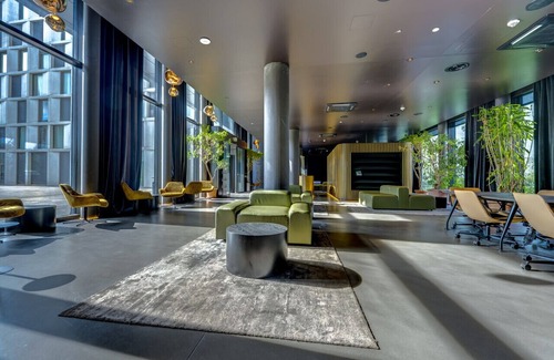 Ein Hauch von Glamour empfängt dich, sobald du das Gebäude betrittst. Die Lobby ist in entspannendes, gedämpftes Licht getaucht und kontrastiert mit den schimmernden goldenen Elementen in der Eingangshalle. Der offene Bereich im Erdgeschoss bietet eine Entspannungszone, in der du dich mit anderen Personen die neu in Zürich sind, treffen und austauschen kannst.