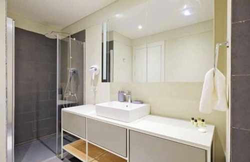 Bathroom - This modern bathroom has a beautiful-looking mirror, shower, and sink. Constant hot water and high water pressure are available. The toilet seat has a bidet.