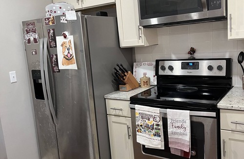 You want close, you got it! Walking from our condo Davis Wade Stadium, the Hump and Dudy is eight tenths or a mile; 1.1 mile to Nusz Park, and track/field. Less than 2 minutes to be on campus!. It is fully furnished with 2 bedrooms with ensuites, a king sofa bed with a half bath in the hallway, and free wifi perfect for a six-person stay. Our kitchen is stocked with all kitchen needs, a Keurig/coffee maker, and a refrigerator with an ice maker. There is a grill and outside seating. Two reserved parking spaces are available. Our back porch is a great place to start or day or end it.
