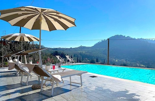 Luxurious Tuscan house located on the green hills of Montecatini Terme for up to 10 people. This old Tuscan house from the 1800s, completely renovated, has been tastefully redecorated. Air conditioning, Internet Wifi, you will find all the necessary comfort to spend a marvelous stay in Italy: with 4 beautiful bedrooms and 4 bathrooms, a large living room with a billiards and a playroom, a fully equipped kitchen and a garden of olive and cypress trees.