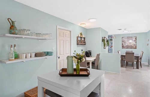 Palm Paradise features high-end coastal chic furnishings & décor in a spacious split floorplan. The three bedrooms feature high end linens, 2 living room areas, dining room and has a well-appointed, large kitchen with new appliances and lots of counterspace! The dining table seats six, and you'll find even more dining options at the breakfast bar and poolside at the patio table. The living room has a large sectional, 50" Smart TV and a cozy fireplace.