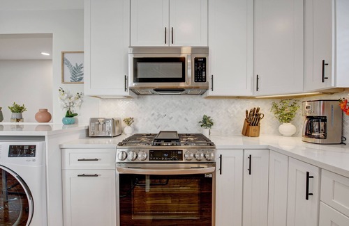 KITCHEN: Stainless steel appliances, washer and dryer, pots and pans, mixing bowls, knife block, toaster, tea kettle, coffee maker, coffee, olive oil, salt, pepper, cooking utensils, dining utensils, plates, bowls, wine glasses, mugs, and cups