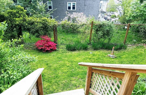 This ground-floor apartment with private entrance has lovely hill-side, ocean and tree-line views. High on the peaceful and historic Jones Hill, less than a half mile from Savin Hill Station on the Red Line Subway, it combines the transportation convenience of the city with the giant leafy trees, rolling yards, horizon harbor view, and charming architecture of this old established residential area. Wood floors, white walls, large decks, long views--a relaxing place to stay, fully furnished and fully equipped. Just open your suitcase and you are home!