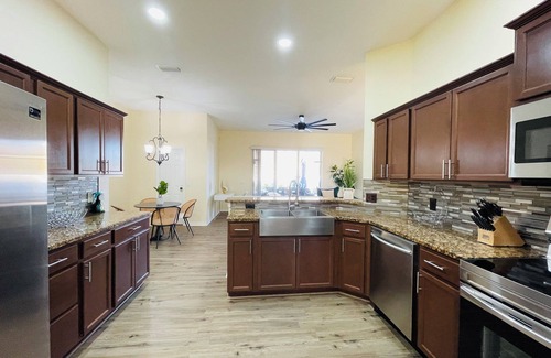 This charming 4-bedroom house has recently been renovated and features modern amenities. Located in a peaceful neighborhood, it boasts a beautiful backyard pool area. The fully equipped kitchen has everything you need to cook, so you don't have to worry about packing any kitchen supplies. This cozy home is perfect for your stay as it offers both comfort and convenience.
