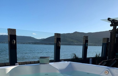 Beautiful house facing Lagoa da Conceição, in Barra da Lagoa Beach, 2 suites (1 with full view of the lagoon, on the top floor), 1 ground floor suite plus a bedroom, and 1 bathroom. The house has rustic décor in demolition wood furniture, with Bali style Buddhas throughout the residence. Walled 2 Car Garage with Security Cameras, Kiosk with Bathroom, Oceanfront Deck. Outdoor heated oceanfront Jacuzzi, deck lighting, garden and glass-covered pergola. The kiosk has full sea view, equipped with barbecue and wood stove. Climatized cellar, Full Kitchen and well equipped.