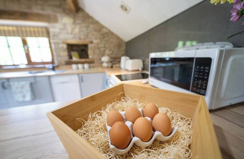 Upstairs you'll be welcomed into our open-plan living area that seamlessly blends rustic charm with modern comfort. The spacious living room area is perfect for relaxing after a day exploring Shropshire. Our fully equipped kitchen comes with everything you need, including a double oven, fridge, dishwasher and microwave. A washing machine and tumble drier are located downstairs. The dining area has plenty of room to sit six comfortably.