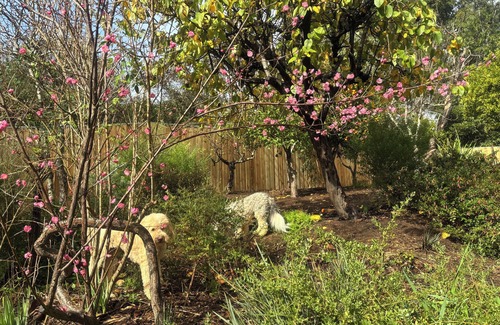 The lounge is perfect for chilly evenings with a crackling woodfire. Another set of French doors leads out to a peaceful garden courtyard—ideal for morning coffee or an evening wine while your pup keeps guard.