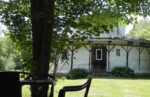 Rivendell is a magical 9.1 acre off-grid retreat with 3 separate buildings. The main house has 2 bedrooms and a full bathroom with on-demand hot water for the shower and a composting toilet. It sleeps 6, in one queen, double futon couch, twin and a small cot. One of the twin beds and the cot are on second floor. The queen is in the bedroom, and the double futon couch is in the living room. The Cordwood Guest House is just one room which has a King bed that can be converted to two twin beds, a kitchen island with a two burner alcohol stove insert, a sink, and a composting toilet. The Strawbale Studio has two twin beds, and another composting toilet but no sink. There is a spring fed year-round stream at the back of the property, and there are walking trails wandering through a mix of forest and meadow with blackberries and apples in season, and lots of birds and wildlife. Since it is solar powered, it is important to be mindful of power usage, especially at night. It is very private. The driveway is 700 feet long, but there are helpful neighbors nearby.