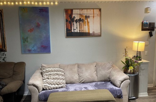 One bedroom luxurious apartment, with shared swimming pool and Jacuzzi. Communal movie theater and pool table/shuffleboard. California king size bed with 75 inch QLED Samsung Smart TV. Wireless Internet. Key less entry.