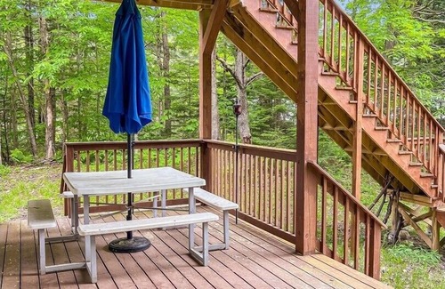 Escape the hustle and bustle of everyday life by booking a stay at this beautiful Adirondack Home in the Okara Lakes Community. Peaceful Oasis is located on Lake Easka, a non-motorized lake perfect for fishing, swimming, and kayaking. This private home has 4 bedrooms and 3 full bathrooms. On the first floor, you're greeted by the expansive great room with a pellet stove and a smart TV, a fully equipped kitchen, a 1st-floor bedroom (with double bed), a full bathroom, a large mudroom and a massive covered porch, overlooking the Lake Easka inlet. Three additional bedrooms are found on the 2nd floor; The master bedroom with a King and the others with 2 twins each. The master bedroom (with the King) also has a sitting/work area, smart TV and a large covered balcony overlooking the backyard and inlet. Enjoy the convenience of Wifi, Smart TV, 7 kayaks and bicycles for your use. This property is just minutes from the heart of Old Forge where you'll find shops, restaurants, hiking trails, a historic movie theatre, a waterpark and so much more! Available for rent year-round; By the week in the summer (Sunday - Sunday), a 2-night minimum the rest of the year (excluding holidays). Directly on the snowmobile trail system, this property has a garage and plenty of room for trailer parking.