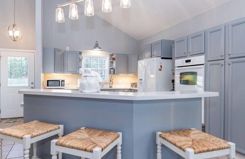When you walk in through the front door you will see a wall of windows framing the beautiful backyard and views of the water. To the left is the expansive kitchen with everything you need! The kitchen overlooks the spacious living area with a giant flat screen TV. The room transitions seemlessly to a lovely dining area with water views that will make you want to stay just a bit longer.