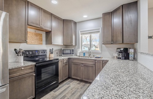 + Updated kitchen with electric stove and oven, microwave, full-size refrigerator, dishwasher, coffee maker, and a variety of convenient small appliances!