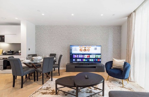 Gym, Swimming Pool, Dedicated work place/ meeting room, Children's playground/Nursery in this gated development. Double beds, smart TVs in bedrooms, another TV in living room. Fully equipped kitchen.