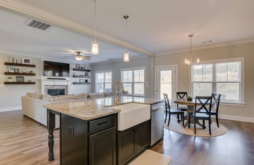 The kitchen features granite counter tops and large kitchen island. The owner's suite features late en-suite bathroom and temper-pedic mattress for extreme comfort. There is a full dining room in addition to eat-in breakfast table. The butler's pantry will have all of your morning coffee needs! The outdoor covered patio has seating for guests in addition to a large yard with access to the blackstone grill. There are 3 full bathrooms, with one bathroom and bedroom downstairs. Upstairs there is a sectional couch and massage chair to enjoy movies or tv on a 120 in projector screen. There is also enough space to add an additional bed if requested.