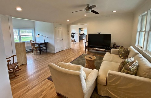 The open plan makes dining indoors/outdoors a breeze. You can cook the largest turkey in the large Bertazzoni stove. Eat in or alfresco under the covered outdoor deck, making for many relaxing family dinners and extended games. Our living room has a working fireplace for colder weather. Entertain at the bar with sink, fridge and dishwasher. Yes, we have high speed internet (100+mb/sec) and Wi-Fi in the house.
