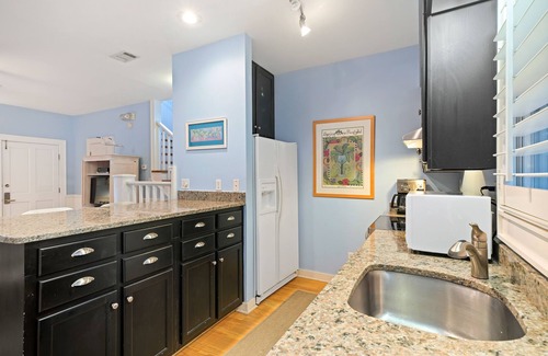 The main level is where you'll find your living and dining areas complete with a large flat-screen TV, a good-sized kitchen with granite counter tops, bar seating for 2 more, and additional seating for 2 more at a cafe table. The full kitchen offers a five-burner electrical stovetop and full oven, dishwasher, microwave, full-size refrigerator (with water dispenser), coffee pot, and toaster; all you need to prepare a meal at home. Off the living area is a small screened porch with Adirondack seating for two, perfect for a morning coffee escape.