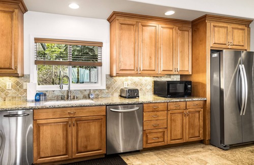 The kitchen at Piko Nani is furnished with all large and small appliances, as well as all of the culinary essentials needed to create a gourmet meal for you and your guests. An open-concept design, the kitchen features a bar with additional seating, perfect for conversing with family and friends while you cook. There's additional dining space in the living area, making it easy to accommodate all of your guests comfortably.