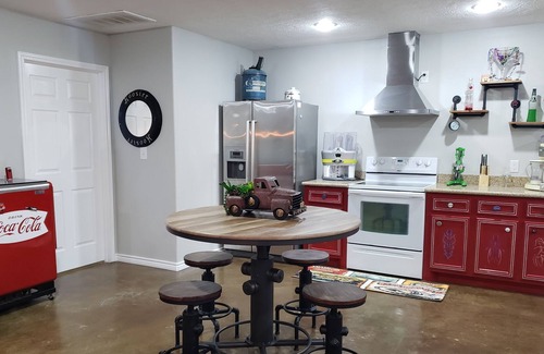 Awesome Automotive Themed Barndominium. . This is a fully functioning private barndominium equipped with pinball machine, Double Diamond slot machine, shuffelboard, 8' Olhausen pool table, Vintage Arcade, vintage stand up Coca Cola Cooler, 65" Flatscreen TV, Margaritaville frozen drink machine, Margaritaville mixed cocktail machine, Jagermeister ice cold shot machine, and much more. This is a 1 bedroom master suite with master bath, the 2nd bathroom is located off the kitchen.