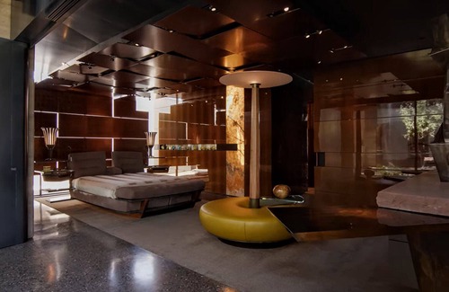 The master suite is accessed through a signature steel telescoping door. Walls of onyx glows with daylight and an origami bronze ceiling sculpts a uniquely sensual space. The pivoting shower wall that transforms the indoor shower to an outdoor private retreat is one of many inconceivable secrets of this house.