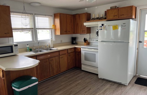 The house offers a single floor plan with cozy living area including living room, dining area and kitchen. There are three bedrooms, two with a queen bed and one with a full/twin bunk. Guests share one bathroom with a full sized tub/shower combo and an outdoor shower. The deck of the house offers additional space to enjoy the location which includes gorgeous views of Potter Pond.