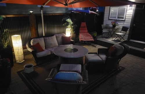 Outdoors, enjoy luxury with a relaxing patio area featuring a full patio setup, a fire table suitable for dining or games, and a large umbrella for shade or rain protection.