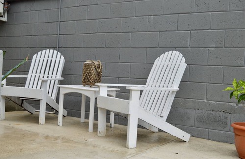 The bedroom includes a comfortable queen-size bed with crisp white linens and soft, fluffy pillows, ensuring a restful night's sleep. You'll wake up each morning to the sounds of birds chirping, before stepping out to a sitting area to soak up the sun. There is also a smart TV that has integrated streaming services. To have a personalized experience, just enter your credentials.