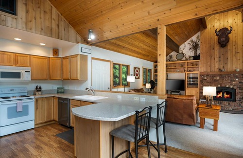 As you step inside you walk into the living room that features a beautiful wood burning fireplace with provided wood, vaulted ceilings and large picture windows framing the beauty right outside. Also on the main level there are two additional bedrooms, a bathroom and access to the main deck. Head upstairs to the loft bedroom where you will find two Double beds and a perfect hang out area for the kids after a long day of lake adventures.