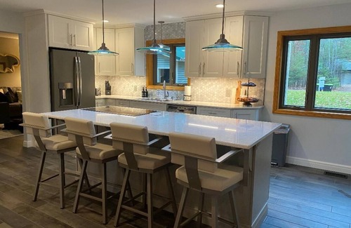 Outdoors, the house sits on almost an acre of land with plenty of room for outdoor games, enjoying the fire pit or sitting on the large deck. There is room for you to enjoy sitting on the dock and watching the sunset! For outdoor enthusiasts, you can take the paddle boat or the Kayaks! In the summer, you can hike or bike the Seven Bridges Nature Area or head to Shanty Creek Resort for snow sports in the winter!