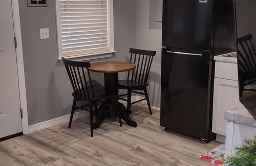 Our cozy detached guesthouse. You will enjoy sitting in the comfy living room area as well as sleeping in the comfortable queen sized bed while watching TV in the private bedroom. Enjoy cooking your meals or bringing back take out in the small, fully equipped kitchen. The front porch is is fully covered with chairs. There is private parking sectioned off with privacy fencing.
