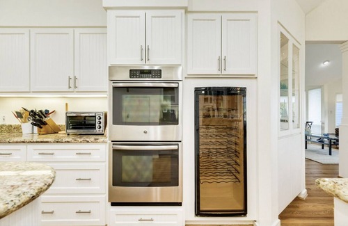 Your family chefs will love the fully equipped kitchen with stainless steel appliances, double oven, and wine chiller. There’s plenty of storage space for groceries and beach snacks, and lots of counter space for everyone to help with prepping family meals.