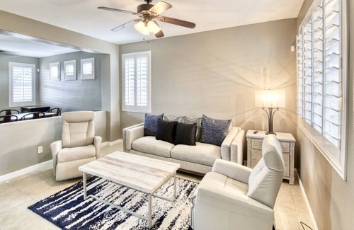 Recently upgraded and beautifully furnished throughout, this private five-bedroom desert oasis features an open floor plan with modern kitchen, counter height-seating, dining area, designated workspace, and living room with Smart TV.