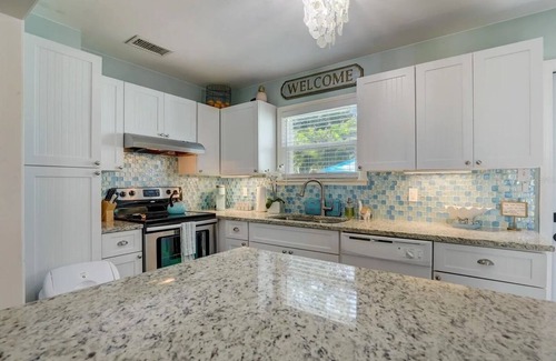 Outside you'll enjoy a backyard landscaped for privacy to sunbath and splash around in the pool, take a quiet nap in the hammock, grill and have a meal on the patio. Inside, immerse yourself into Florida's vibrant spirit with a tropical themed interior. The open living room features a shiplap wall with electric fireplace and large wall mounted T.V. The bedrooms have plenty of space to lay your head after a fun filled day of activities. One bedroom has a full size bed while the other bedroom has two twin size beds and share one bathroom. The open living design and well-appointed kitchen with granite counters, provides the perfect place to entertain during your stay.