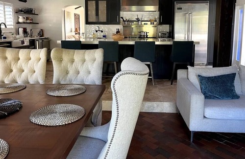 The South Star guest house has 2 bedrooms (one with a queen bed and one with a full bed) and 1 bathroom. There are two large living rooms with tons of comfortable seating, a dining area, and a true chef’s kitchen with Viking appliances including a 6 burner gas stovetop, two ovens, an icemaker, and a beverage fridge.