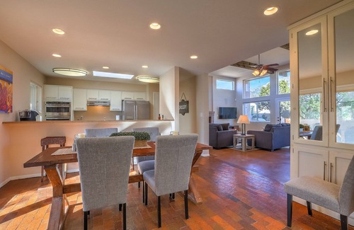 This newly remodeled tremendous vacation home is located at the base of the Sandia Mountains and all they have to offer. Just blocks from Cibola National Forest, hike/bike trails, Sandia Peak Tram and great skiing. In addition, Sandia Pueblo Casino, golf courses, dining, shopping and Albuquerque Balloon Park. Fast reliable WIFI plus two flat screen TV’s and built-in speakers inside and out. Outstanding outdoor living includes two water features, BBQ grill, great privacy and awesome natural light and Sandia mountain vistas.