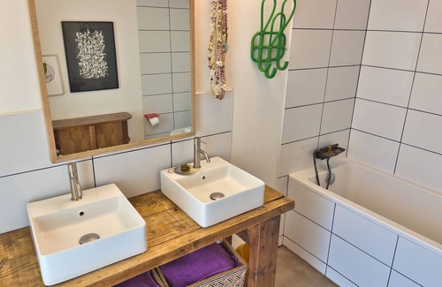 The second floor houses the bright master suite, with a small, rounded balcony offering breathtaking views. The adjoining bathroom, with its shower featuring parquet flooring, creates a unique ambience. A fourth bedroom with futon bed and velux window brings natural light and simple yet elegant decor.