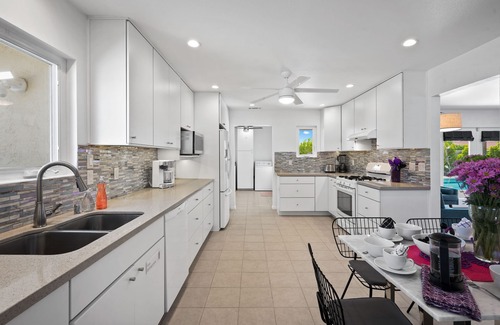 Playtime is in full effect in the backyard where the whole crew will enjoy a large sparkling pool and in-ground spa with plenty of seating and lounging areas under a fully covered patio that runs the length of the home. Have your meals poolside at a dining table that seats eight or enjoy a cocktail in the shade while keeping everything in sight. Need space for the kids (or fur kids) to run around? The Playhouse is stocked with lawn games like Bocce ball and bean bag toss. The backyard offers great natural grass space for outdoors games and fun or to run off some steam and is surrounded by ficus trees for a private tropical paradise. When the sun goes down, fire up the grill, roast some marshmallows over the fire pit and relax under the stars or enjoy a night swim in the pool.