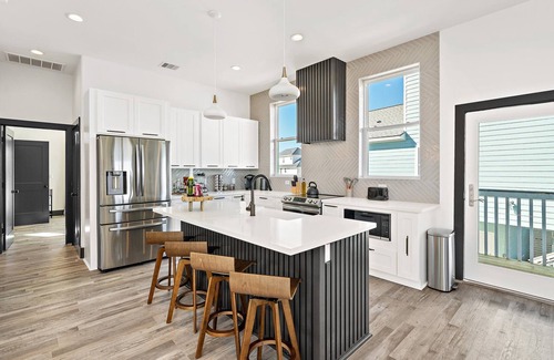 Retreat to the bedroom for a good night's rest, with fresh linens in each room and fluffy pillows. The primary bedroom is set with a king bed, smart TV, and balcony access. Choose between a long luxurious soak or a rinse in the large walk-in shower located in the ensuite bathroom. Head upstairs to the second and third bedrooms which are set with queen beds. Two twin rollaway beds and a pack n’ play can be found in the bedroom closet for additional sleeping arrangements. Connecting these two rooms are a Jack and Jill bathroom set with a walk-in shower. A half bath can be found on the first floor for additional space to get ready.