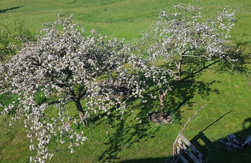 We have a beautiful sun terrace in front of the house with a view of the valley, a garden with fruit trees, meadows, a fountain and streams around the house.