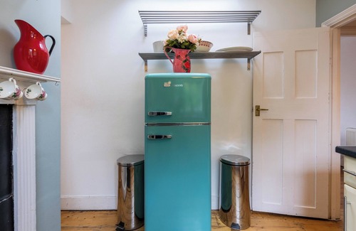 Bright and inviting, the kitchen is fully equipped with everything you might need for an easy, self-catered stay, from an inbuilt hob and oven to a dishwasher, washing machine, cookware, cutlery, and a coffee machine. A large sash window and skylight flood the space with light, while blue accents, wooden floors, and neutral cabinetry give it a homely feel. Whether you're cooking up market finds or grabbing a quick breakfast before exploring, you’ll feel right at home here... if you can resist the incredible local restaurants, that is!