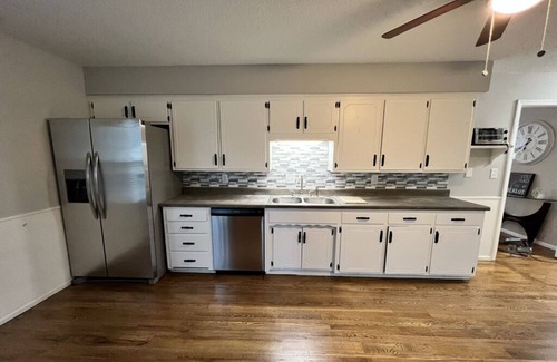 PET-OWNERS DREAM! Two bedroom duplex. Fully remodeled, new stainless-steel appliances with a 5-foot height fenced back yard. Able to accommodate any sized furry friend. All within 15-20 minutes of Airport, Speedway(Legends Outlet Mall), Chiefs/Royals Stadium, Power&Light District and Plaza. In the heart of quaint Downtown Shawnee.